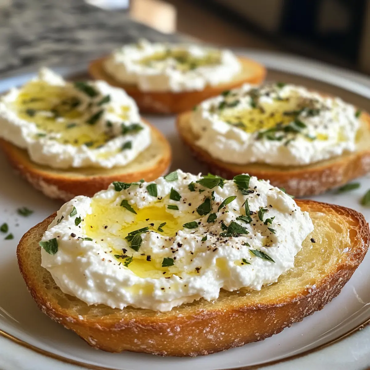 Assemble Crostini: Spread a generous layer of whipped ricotta over each toasted slice. Then, top with fresh herbs or any additional toppings you fancy—get creative here!